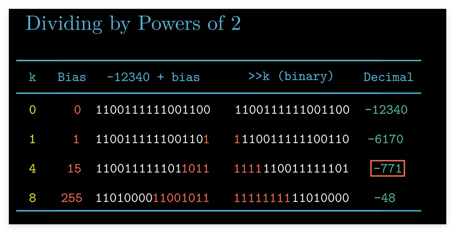- 同样的,除法可以看作是右移操作。对于有符号的负数的算数右移,由于需要满足四舍五入的特性,需要对原数加上 \(2^k-1\) 大小的