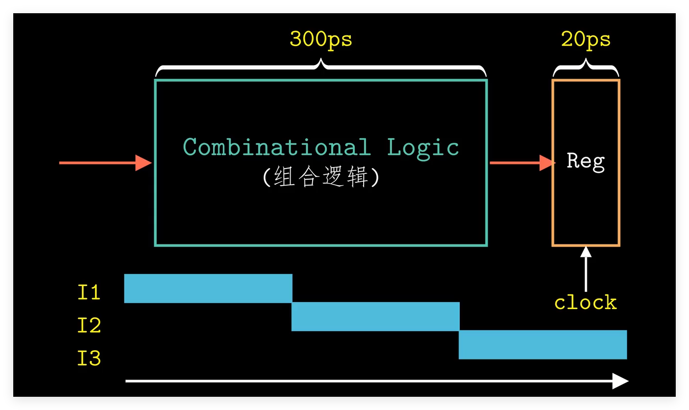 假设一条指令执行需要经过三部分组合逻辑电路,且每部分组合逻辑电路和流水线寄存器的延迟如下,那么可以设置一个时钟周期为 120ps ,且一条指令执行需要 3 个时钟周期