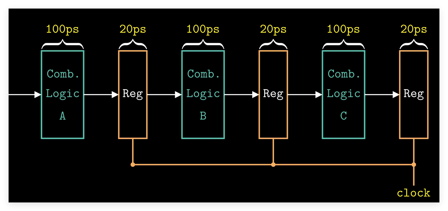 - 对于硬件设计者来讲,将一个整体的设计划分为多个延迟都相等的子阶段是一个严峻的挑战,那么时钟的周期就受最慢阶段的延迟来限制