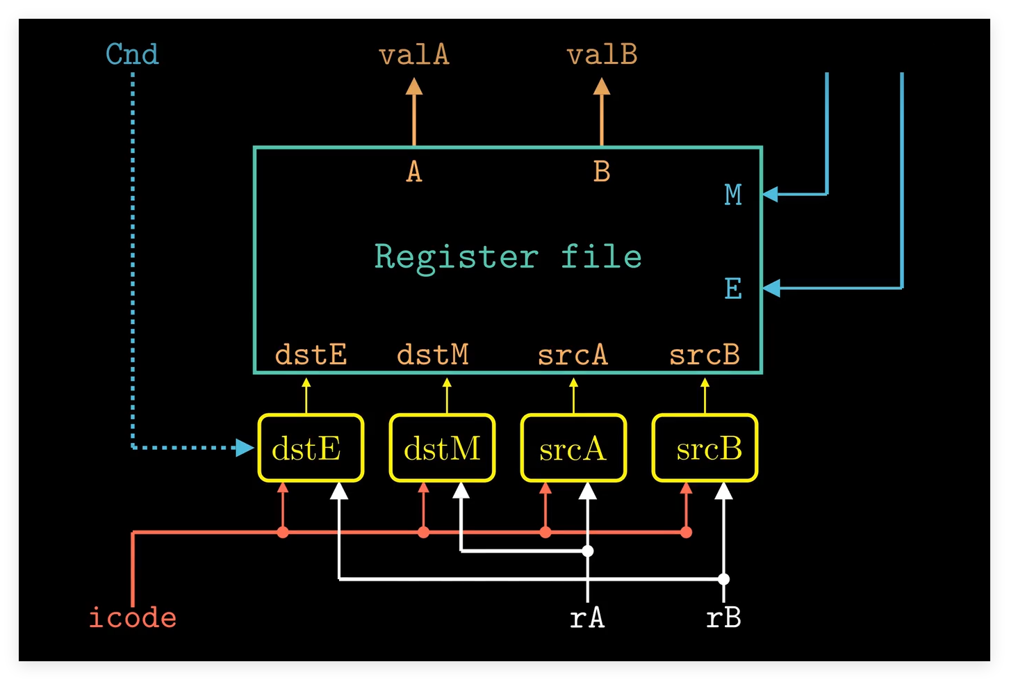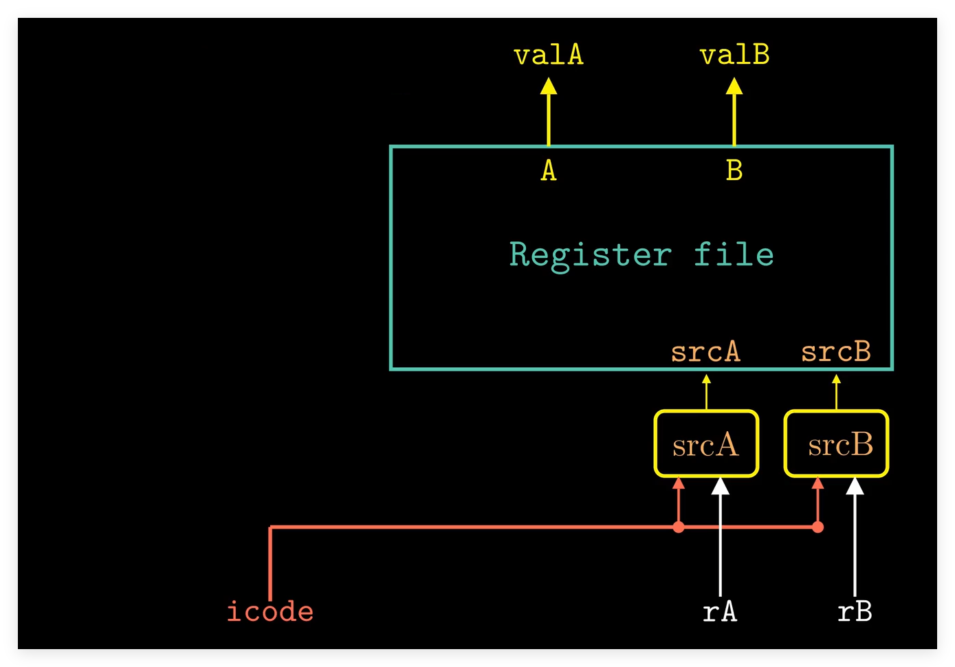 ,支持同时进行两个读操作- 其中要读取的寄存器的 ID 值需要根据指令代码 icode 以及寄存器指示值