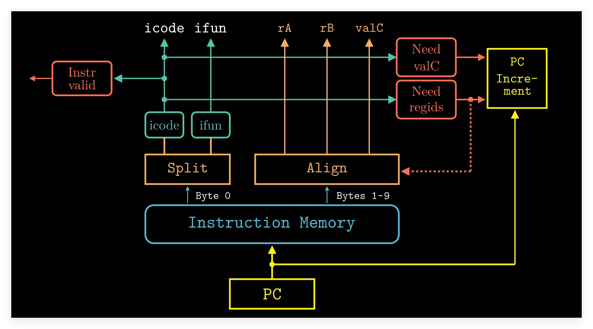 - Fetch:取指阶段以程序计数器(PC)的值作为起始地址,每次从指令内存中取十个字节