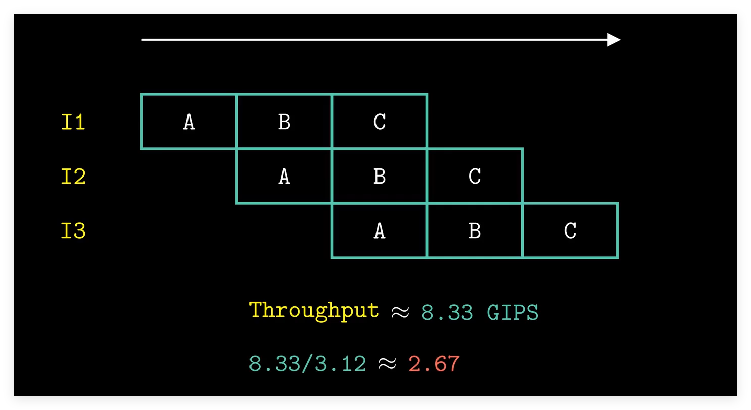 第一条指令经过组合逻辑电路A后腾出了空位给第二条指令,由此可以构造出一个简单的流水线,其吞吐量相比原来的吞吐量提高 2.67 倍
