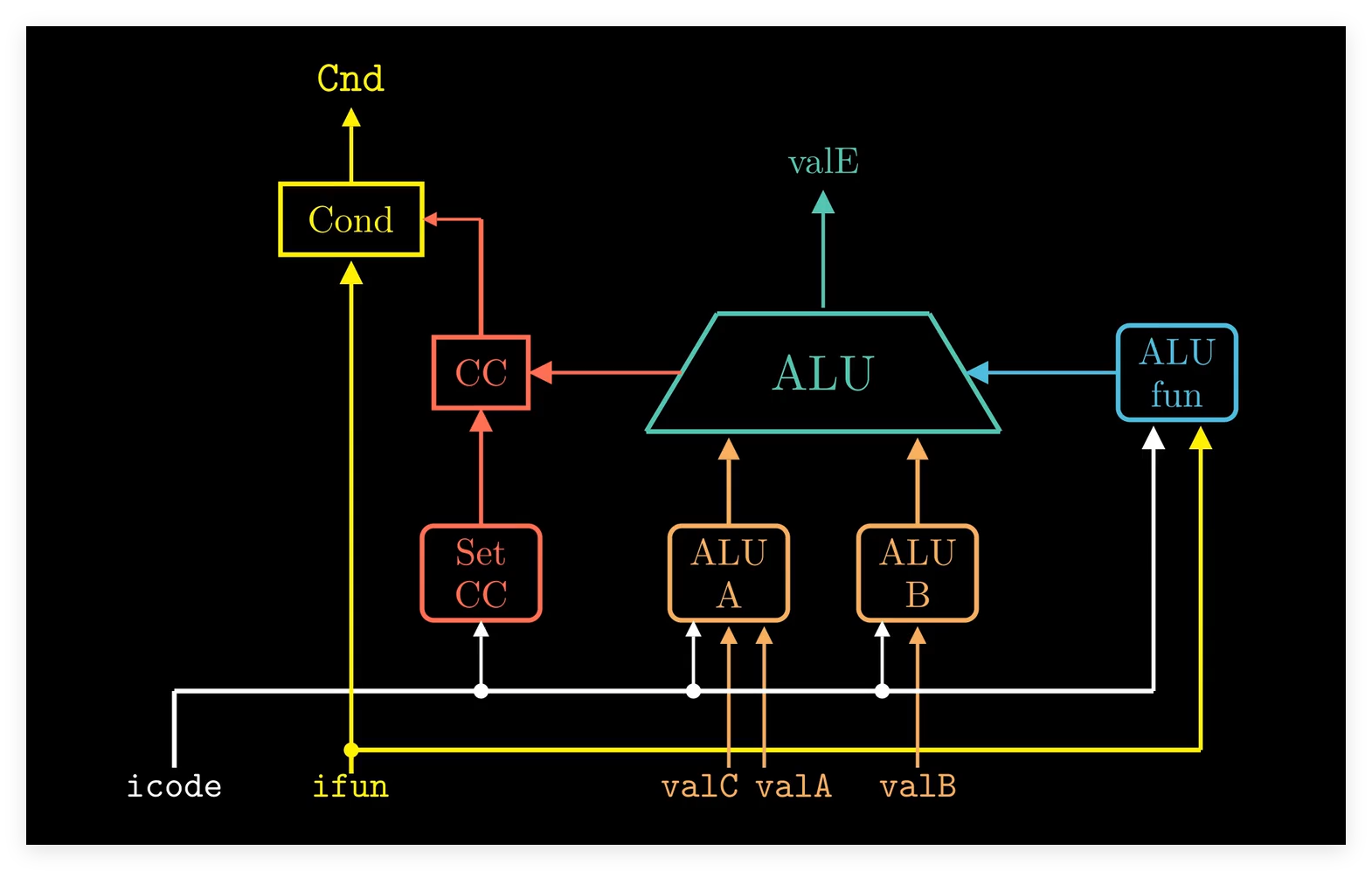 - 每次运行时,ALU 都会产生三个与条件码相关的信号——零、符号、溢出