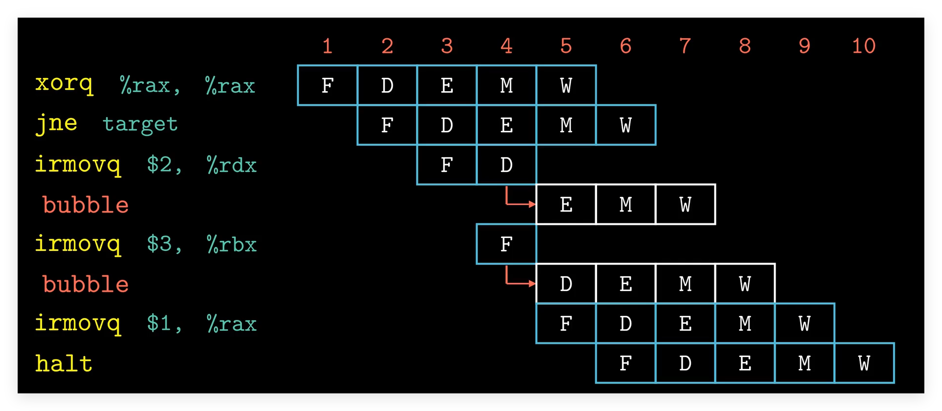 的两个操作数需要先由前两个指令设置,其译码阶段需要推迟到上面两个指令写入阶段结束后。暂停之后,通过插入气泡(bubble)来代替暂停指令的指令,气泡不会改变寄存器、内存、条件码以及程序状态