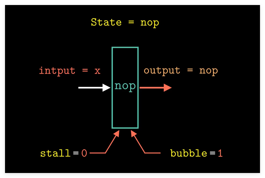 综上所述,流水线实现过程中出现的冒险,都可以通过暂停和插入气泡来实现。暂停和插入气泡的操作可以通过流水线寄存器的输入 stall