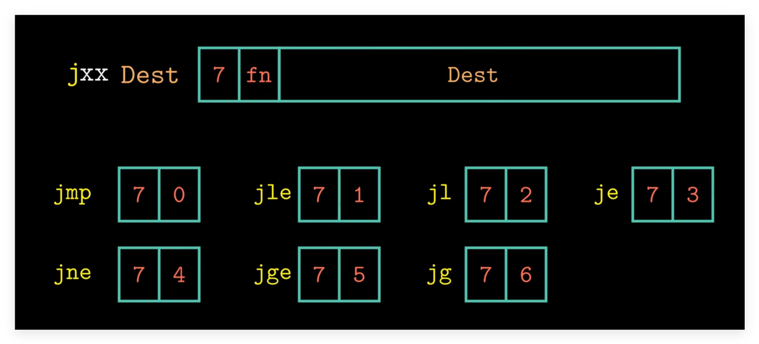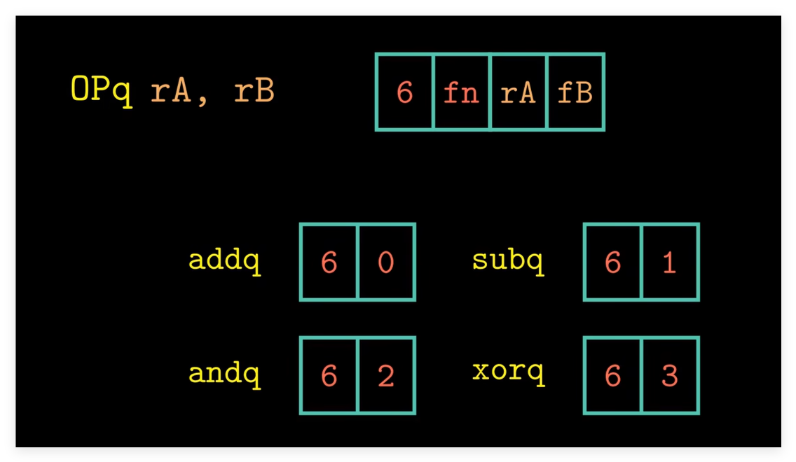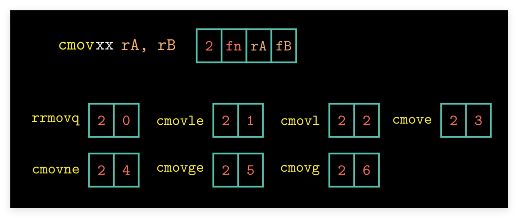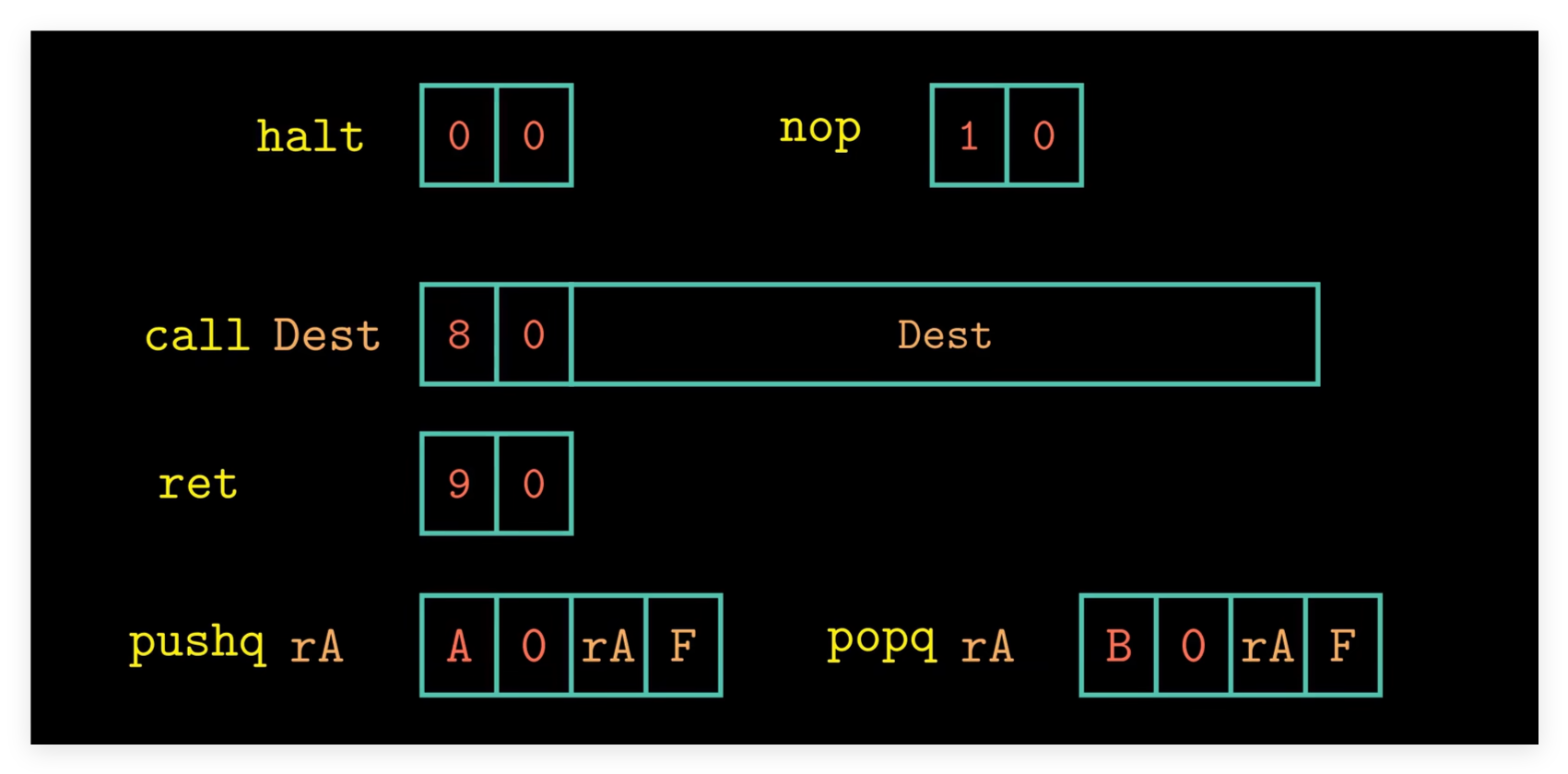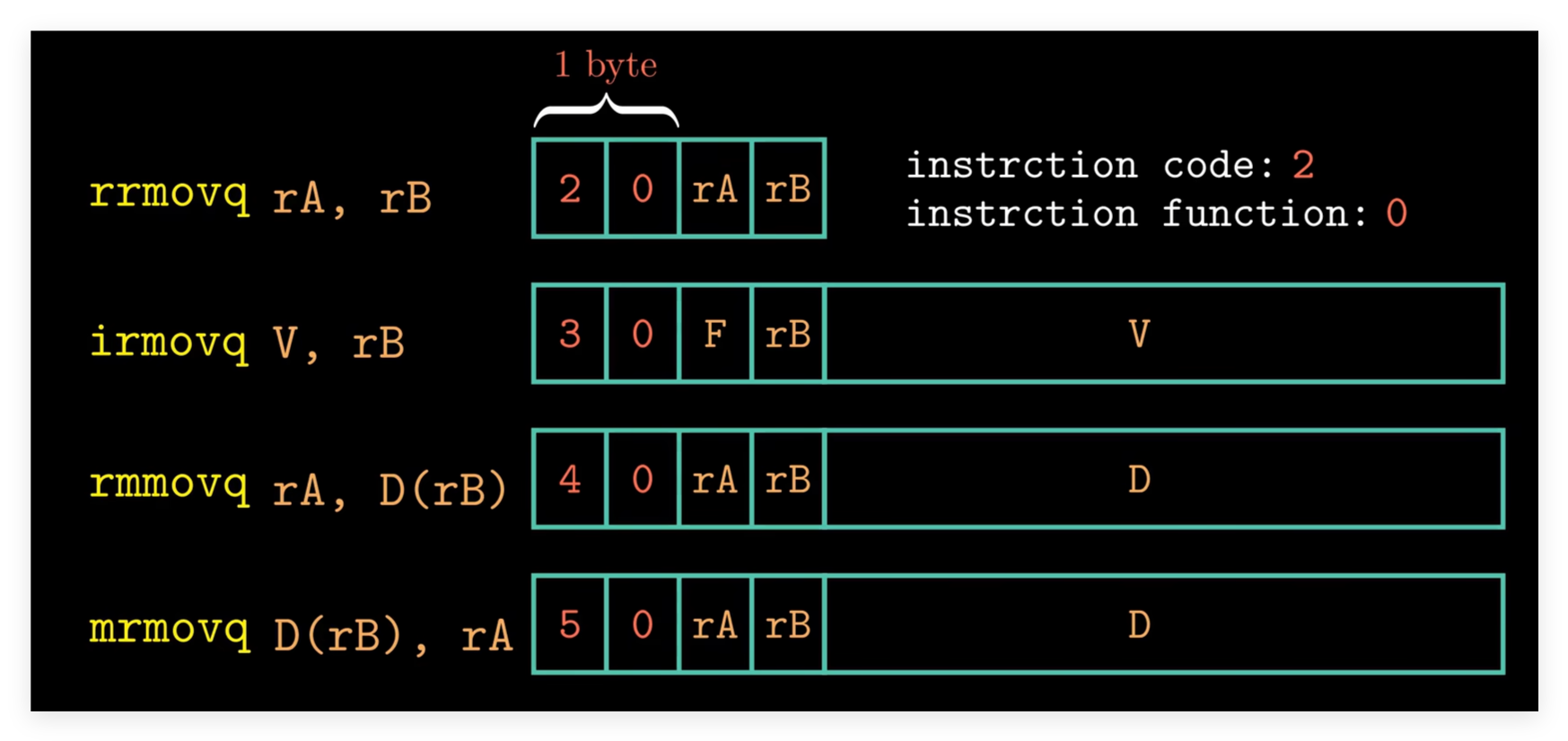接下来我们对上述数据传送指令进行编码,每条指令的第一个字节表示指令的类型。这个字节分为两部分,每一部分占四个比特位:高四位表示指令代码,低四位表示指令功能