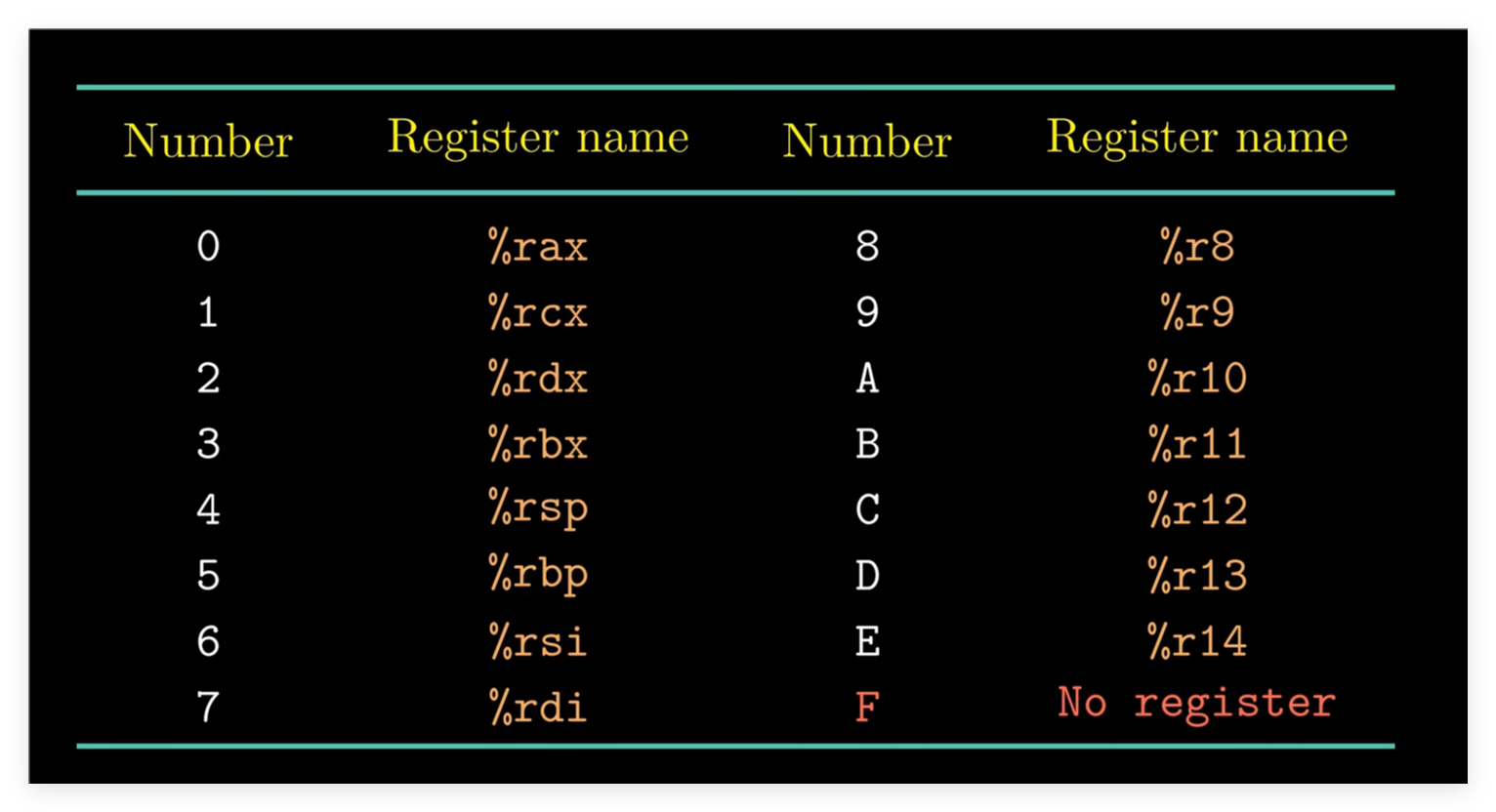 系统中定义了15个寄存器,虽然每个寄存器有着不同名字,但是还需要为每一个寄存器指定一个编号,用十六进制数 0~0xE