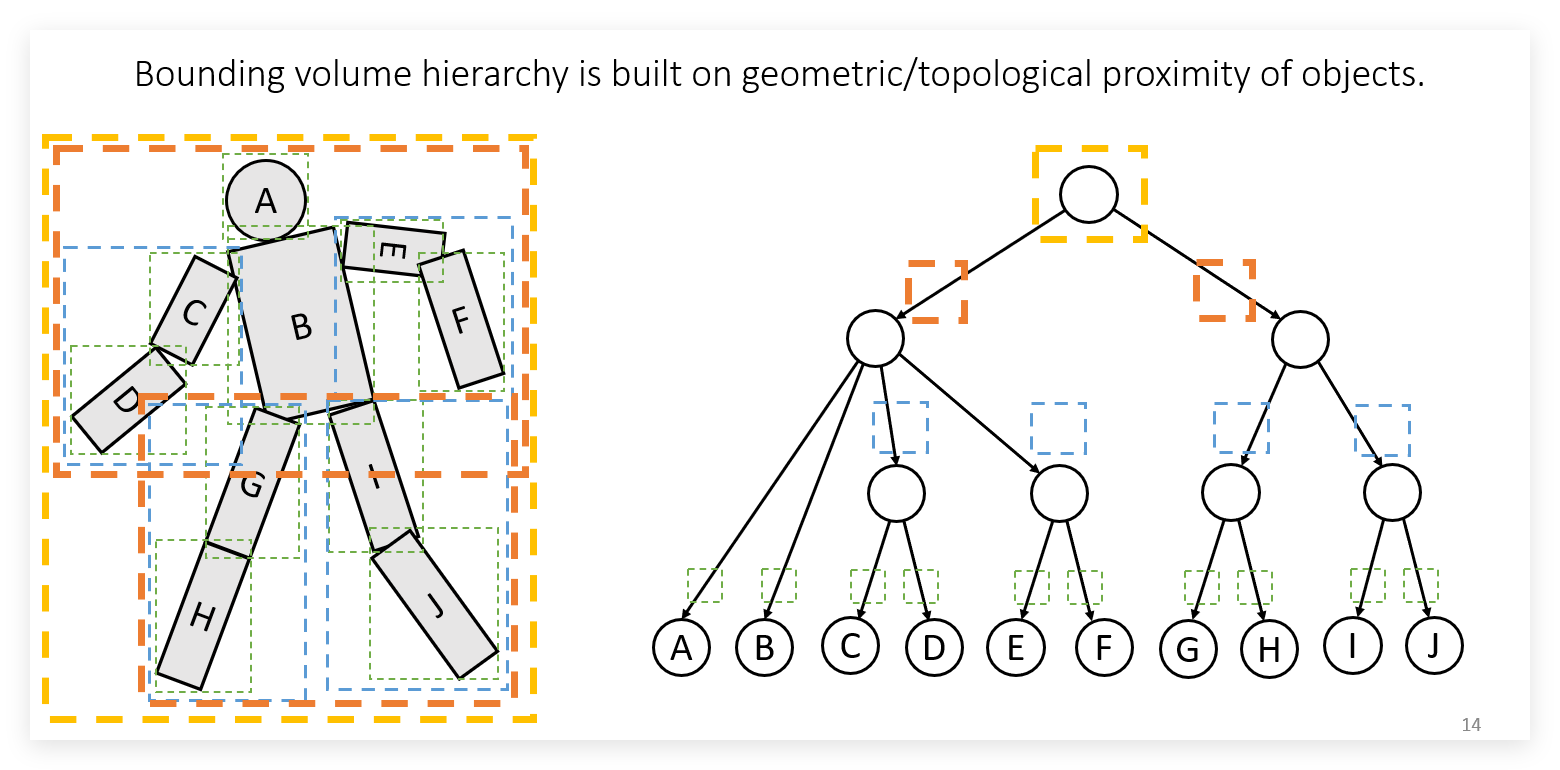 碰撞检测时,从上到下进行判断是否相交,如果大包围盒都没有相交,那么也就不需要判断小包围盒了。