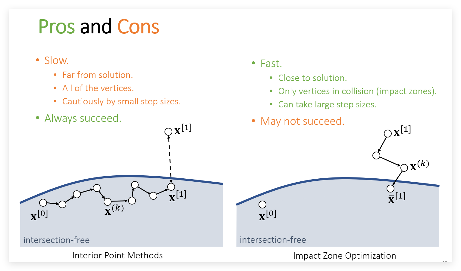 给定两个状态 \(x^{[0]}\) 和 \(x^{[1]}\),我们想要找到一个离 \(x^{[1]}\) 较近的 \(\bar{x}^{[1]}\) ,使得 \(x^{[0]} \bar{x}^{[1]}\) 没有发生相交(即没有碰撞)。 此时有 Interior Point Methods 和 Impact Zone Optimization 两种策略: