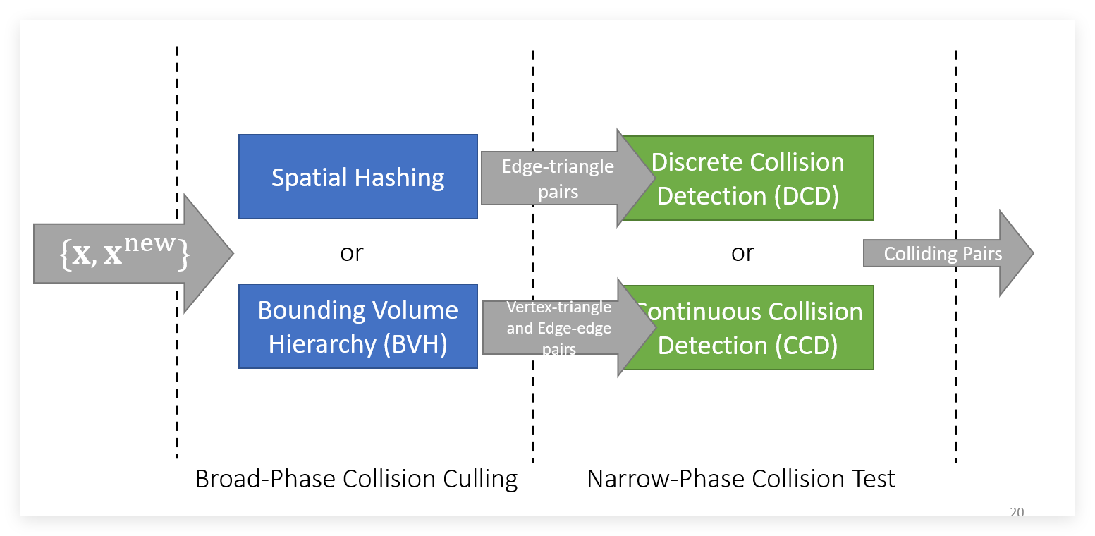 碰撞检测一般分为两个阶段,第一步先用 Spatial Hashing 或 BVH 排除掉大部分不可能发生碰撞的三角形对;第二步再在局部用 DCD 或 CCD 进行碰撞检测。