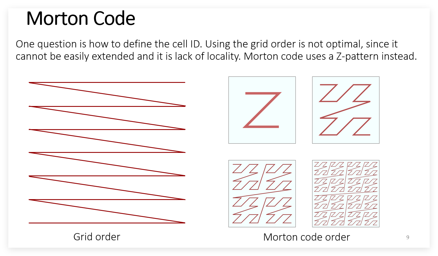 问题在于,如果使用类似上图的 Grid Order 形式,在我们遍历链表的时候不能很好的访问周边格子,Cache 命中率较低,即缺少 Locality 特性。可以采用 Morton Code 作为编号方式: