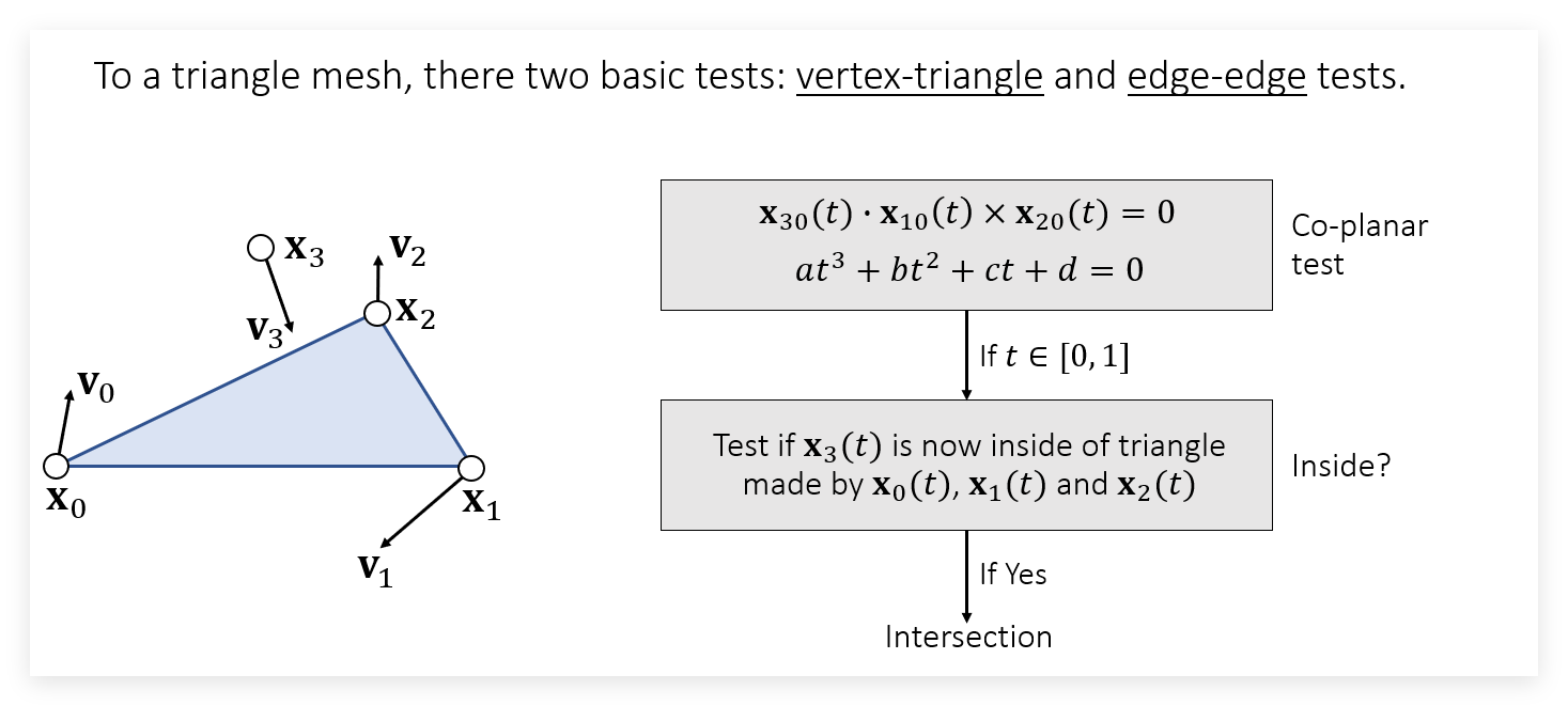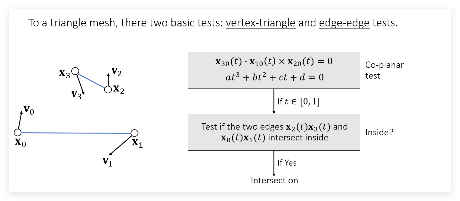 DCD 在离散的时间 \(x^{[0]}\) 和 \(x^{[1]}\) 中检测物体是否相交。对于一条已知的 edge \(<x_a, x_b>\),我们需要检测其是否与三角形 \(x_1 x_2 x_3\) 相交,计算步骤如下: