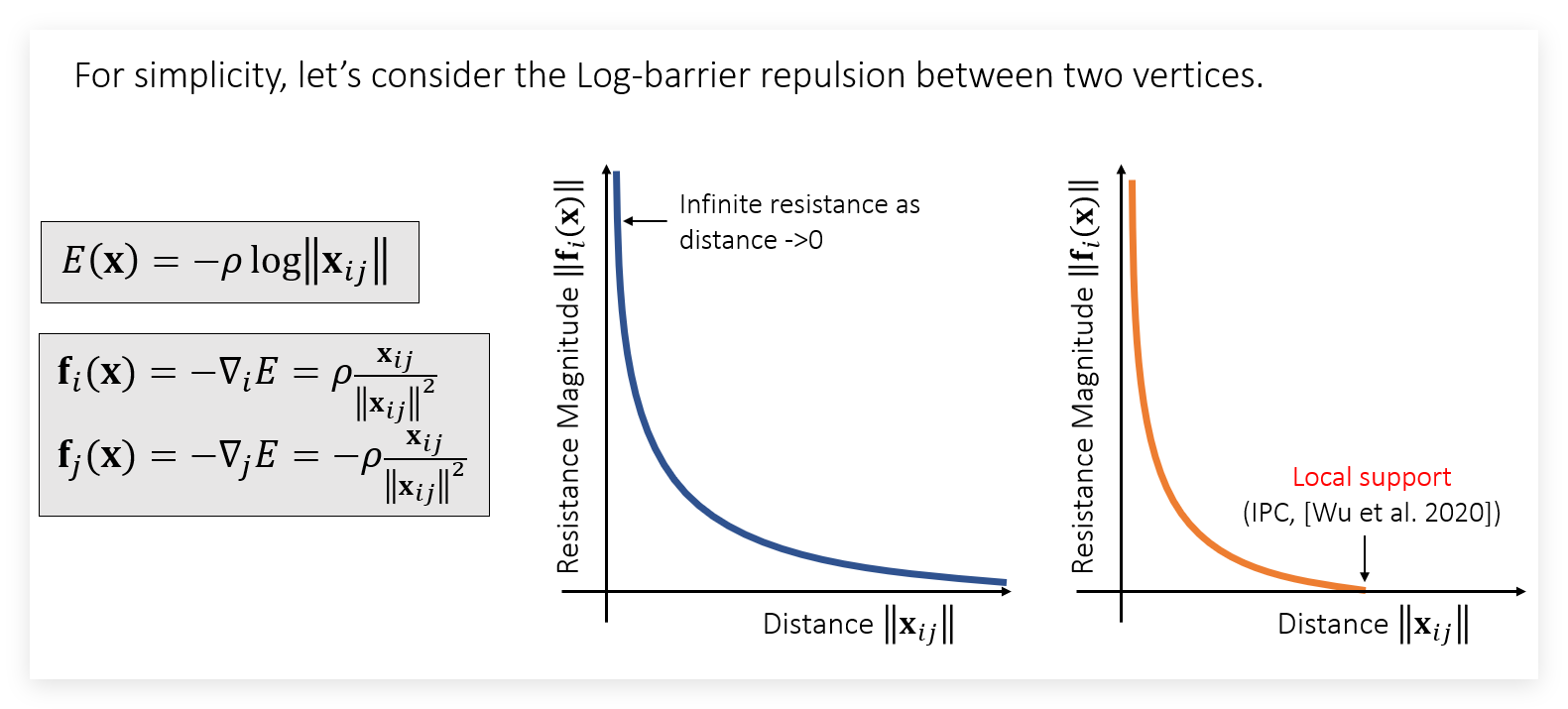 Log-Barrier 内点法设置能量为距离的 log,来求解碰撞最终的合法位置: