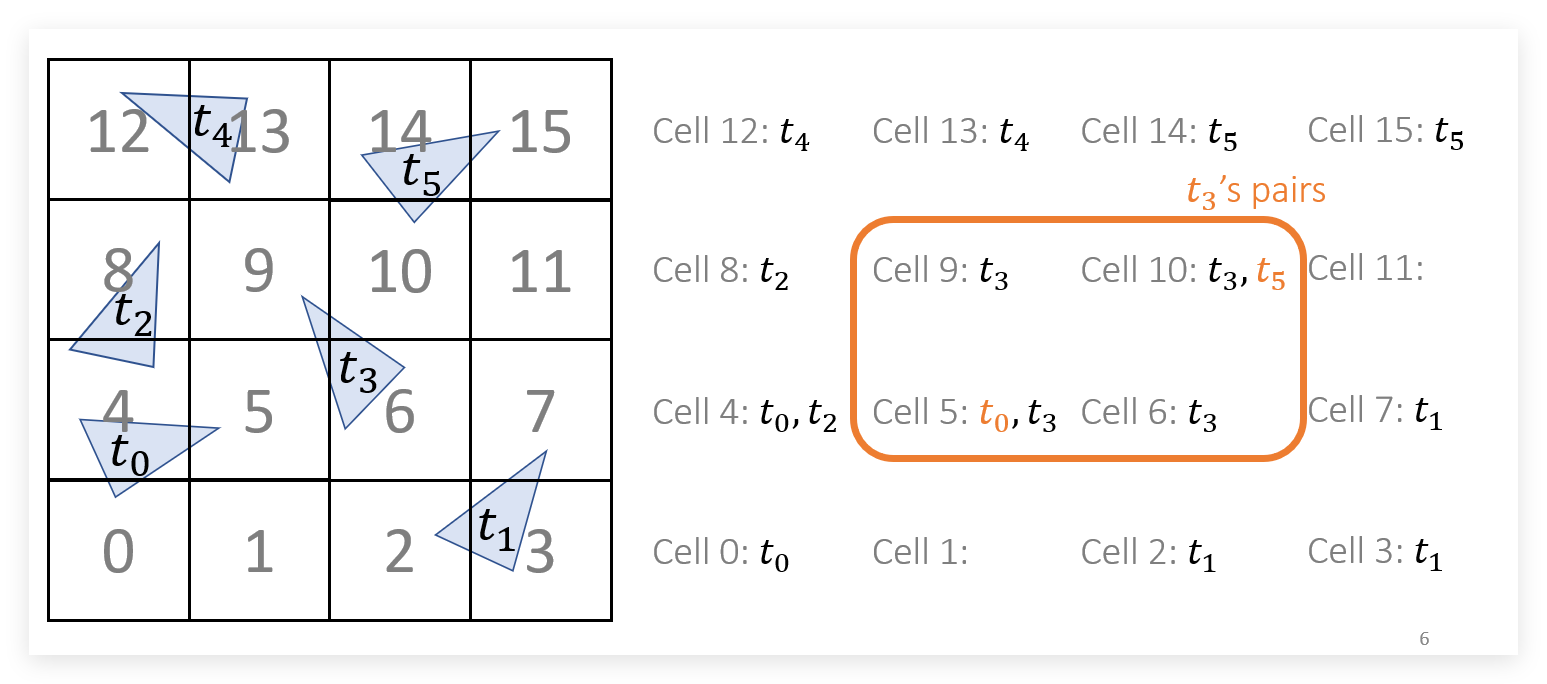Spatial Hashing 又被称为 Spatial Partition,它将空间划分为一个个 bucket,如果三角形与某 bucket 相交,则维护一个该 bucket 到该三角形对象的指向。