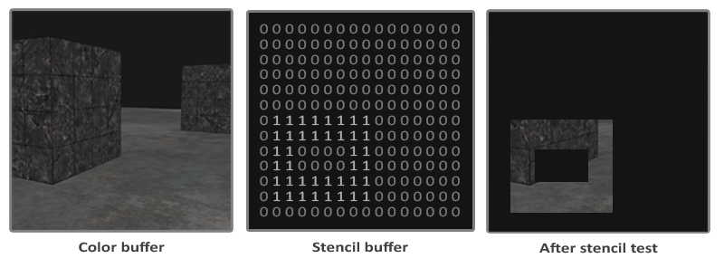 当着色器处理完一个片段之后,并且在进行深度测试之前,模板测试开始运行。模板测试根据模板缓冲运行,它也可能会丢弃一些片段。