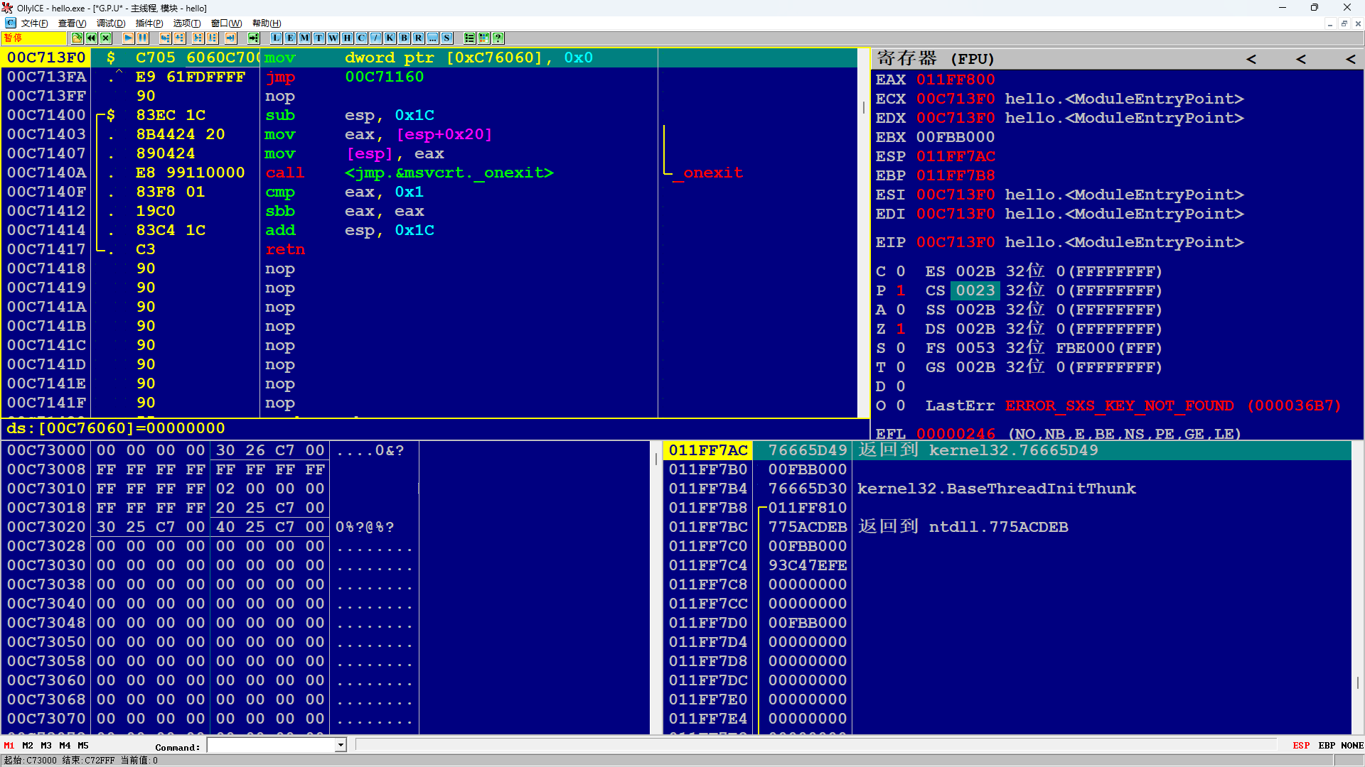使用 OllyDbg 打开 hello.exe,页面如下: