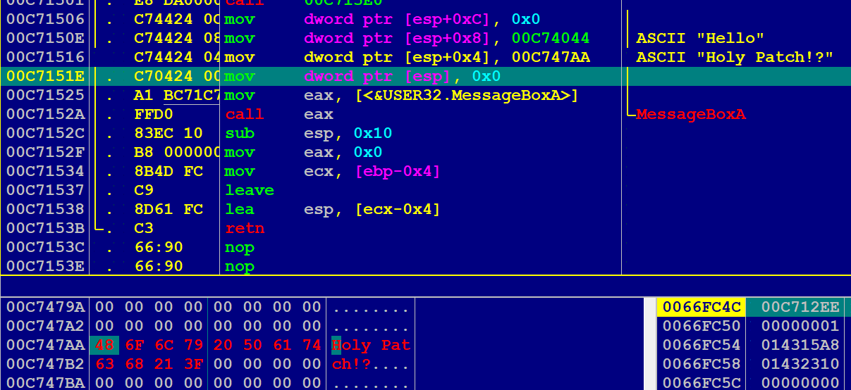 接下来我们尝试对这个程序进行一些更高级的把戏——Patch。为了修改消息框显示的内容,我们同样有两种基本思路。
