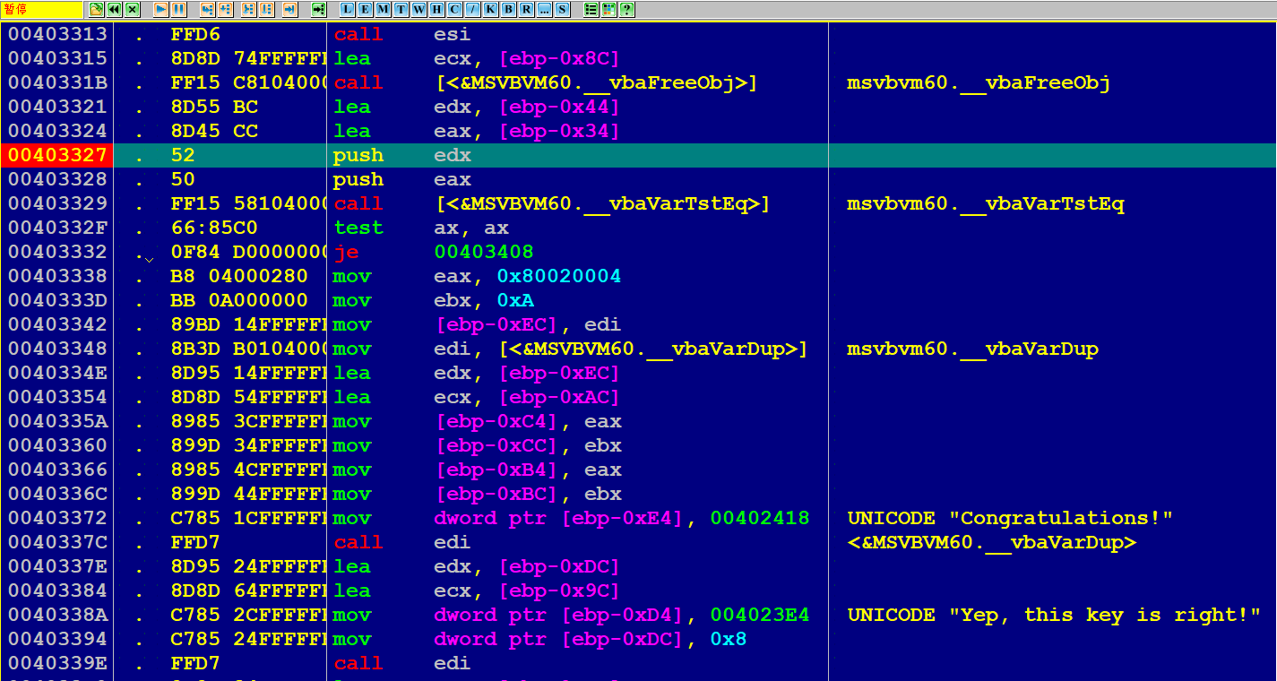 我们在 "Congratulaitons!" 上方找到了判断是否正确的相关逻辑,它会调用字符串比较函数 _vbaVarTstEq 来对正确的序列号和用户输入的序列号进行比较,如果相等则返回 1。随后通过 TEST 和 JE 进行逻辑跳转。