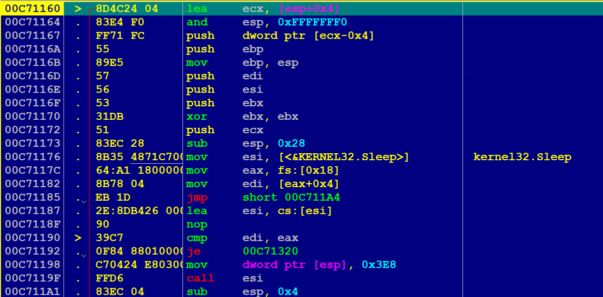 我们观察到第二条指令会跳转到地址 0x00C71160,该地址通常是程序的“启动函数(Stub Code)”。但为了寻找我们的 main 函数,需要进入该启动函数进行跟踪: