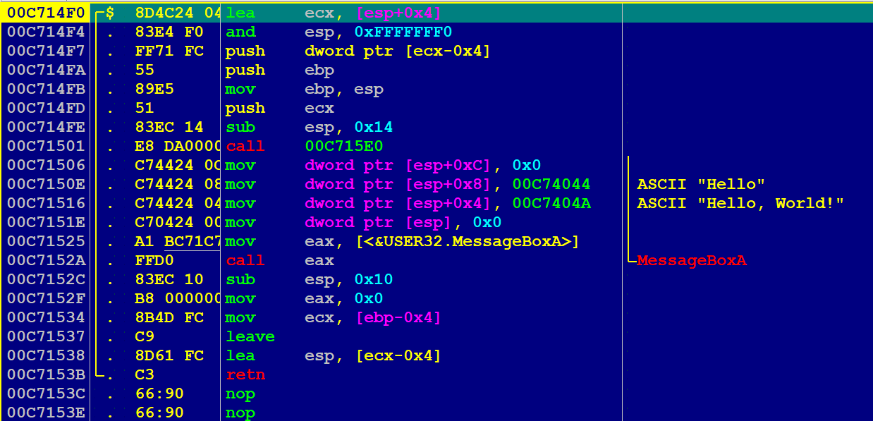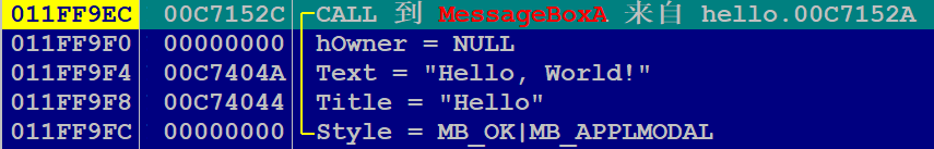 事实上,我们直到 hello.exe 程序会弹出一个标题为 "Hello",内容为 "Hello, World!" 的消息框,使用了 MessageBox API,因此我们可以使用一些更直接的方法来寻找 main 函数的地址。