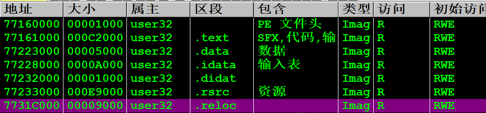 我们打开 View-Memory 窗口(ALT+M),可以看到进程的内存映射情况,在之中可以看到 user32 库被加载到内存中: