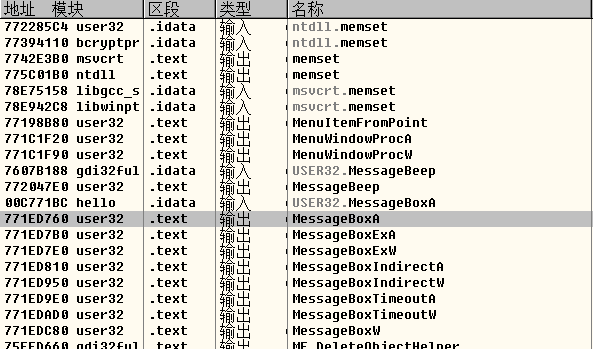 我们需要的是 Export 类型的 MessageBoxA,在书中则用的是 MessageBoxW