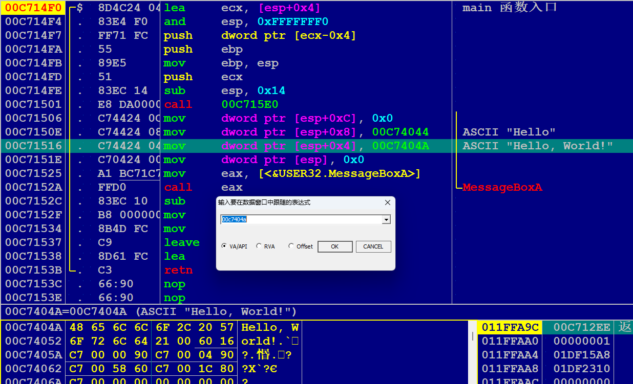 第一种方法通过修改内存中对应地址处的字符串数据完成。我们通过汇编代码得知消息框的内容 "Hello, World!" 位于地址 00C7404A 处,我们在左下角的 dump 窗口通过 Ctrl+G 跳转到该位置: