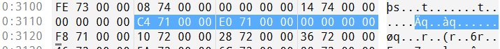 我们的确看到了文件中 INT 和 IAT 各项值均相同。我们进一步跟踪 INT 的第一个表项值 71C4 所对应的 RAW 值 31C4 处,可以发现导入的 API 函数名称为 register_frame_info: