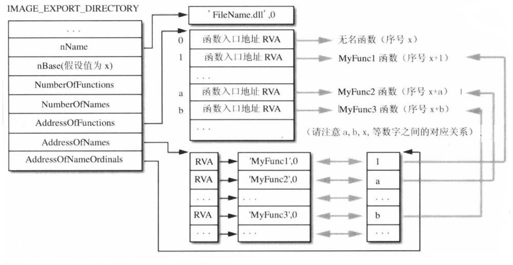 AddressOfNames成员转到“函数名称数组” - “函数名称数组”中存储着字符串地址,通过比较字符串查找指定的函数名称,此时数组的索引为