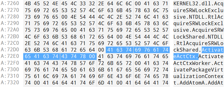 我们以函数 ActivateActCtx 为例,它位于地址 A:72D9 处,即函数名称数组的第三个: