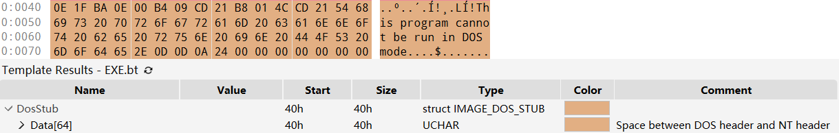 DOS Stub 位于 DOS Header 下方,是一个可选项,且大小不固定。DOS 存根由代码与数据混合而成,其中 40-4D 区域是一串 16 位的汇编指令。