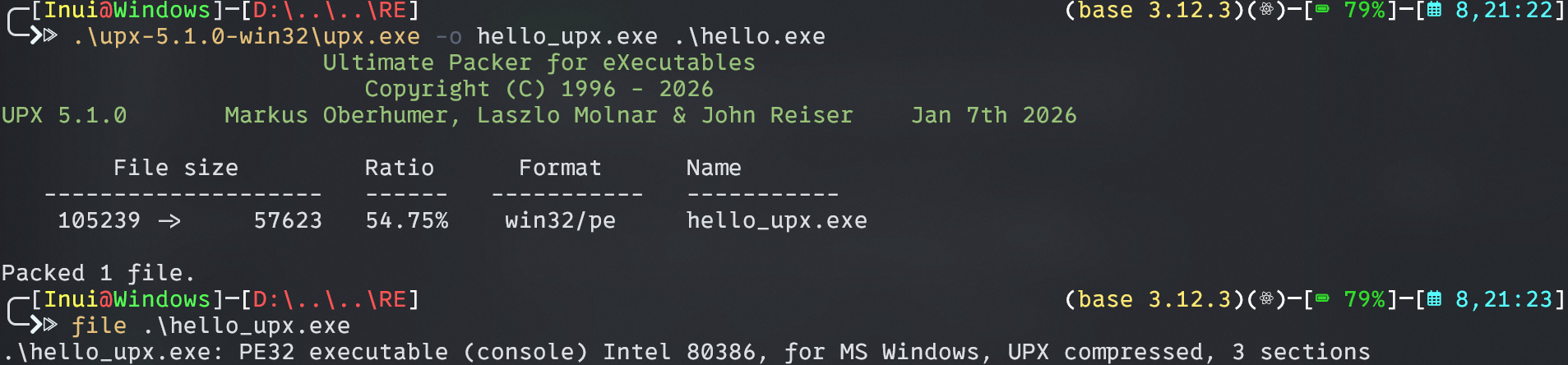 接下来我们使用压缩器 upx 进行测试,对 hello.exe 进行压缩: