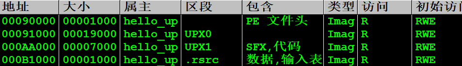 三个节区名分别为 UPX0, UPX1, .rsrc,并且第一个节区 UPX0 的 SizeOfRawData 的值为 0,即为空节区。该空节区用来存放解压后的代码,而解压缩程序和压缩的源代码都位于第二个节区 UPX1 中。