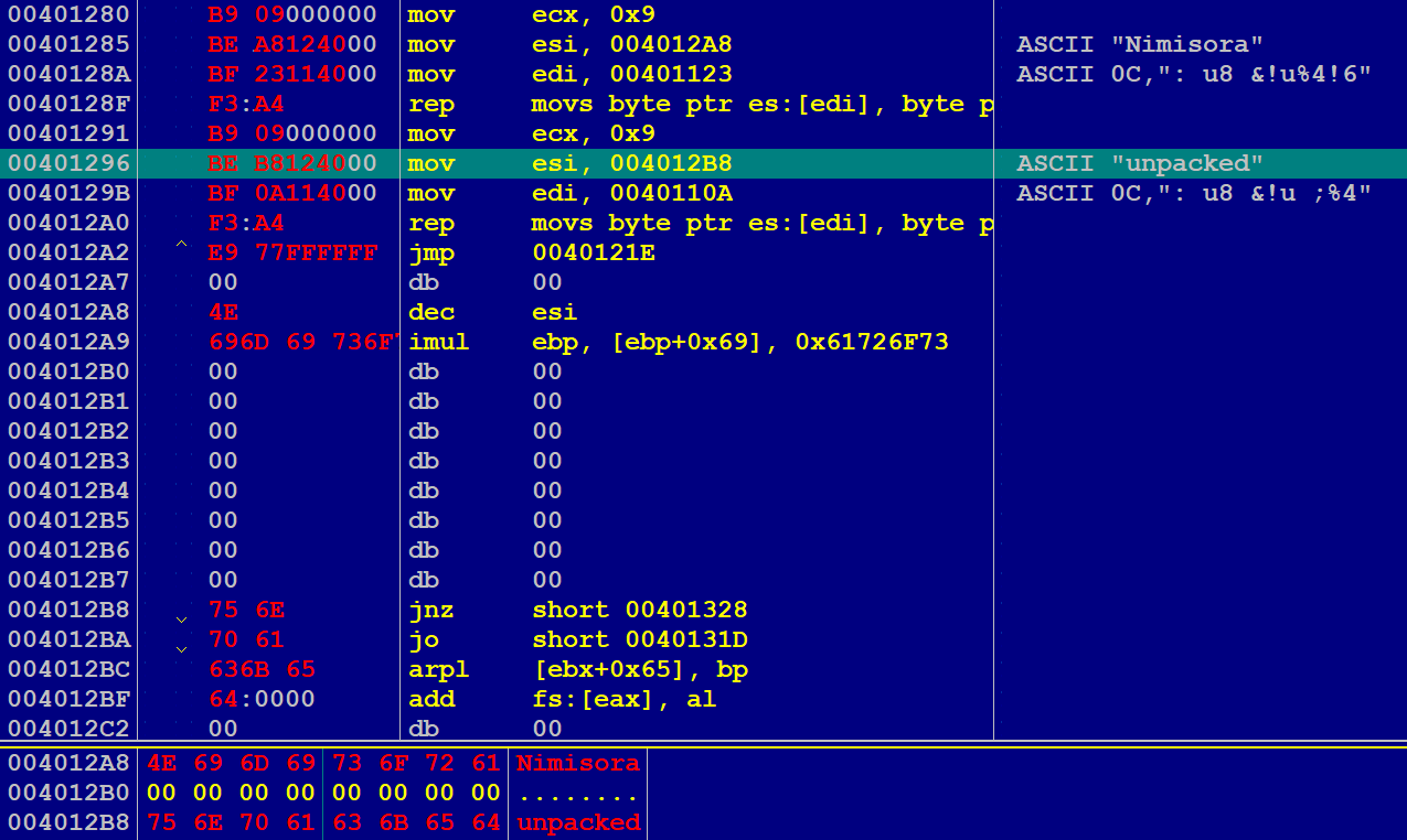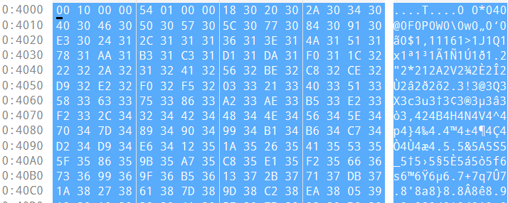 我们现在调试器中对该段进行书写,观察得程序被加载到基址 400000,因此我们希望书写的空白段位于 401280 - 401400 处。