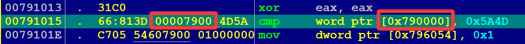 由于指向的是地址,而不是指令,因此 791018h 处就是指令 cmp word ptr [0x790000], 0x5A4D 中的 0x7900,验证正确。
