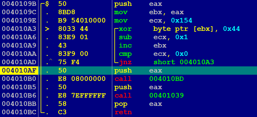 接着进入该解密函数,可以看到开头有段解密循环,对 004010F5 处的数据进行与 0x44 的异或运算,总共执行 0x154 次,即该循环操作的对象是 004010F5 - 00401248 处的数据。