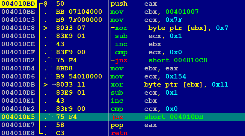 该函数一眼即可见有两处解密循环。其中第一处循环对 00401007 - 00401085 处的数据进行了与 0x7 的异或运算;第二处循环对 004010F5 - 00401248 处的数据进行了与 0x11 的异或运算。最后恢复 eax 并返回。