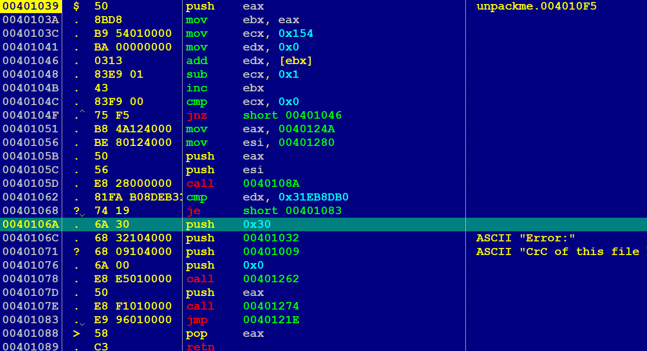 略过中间的解压步骤,我们最终可以看见接近末尾有段代码从栈中弹出了所有保存的寄存器,然后无条件跳转到了 OEP 处: