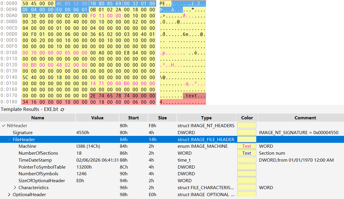 TimeDataStamp: 低 32 位表示从 1970 年 1 月 1 日 00:00 到文件创建时经过的秒数PointerToSymbolTable: 符号表的文件偏移- 如果不存在符号表,则为 0