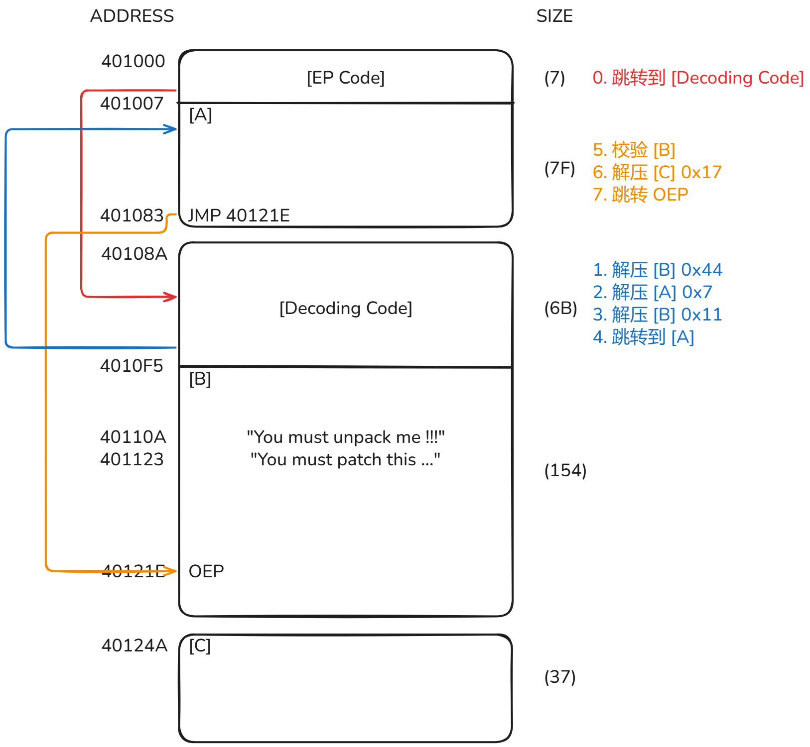 其中只有 [B] 会被校验,我们可以尝试修改 [A] 中的 JMP 40121E 为跳转到我们自己的补丁代码处。
