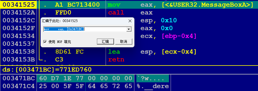 例如对于 hello.exe 中,调用 MessageBoxA API 的汇编语句,我们可以看到它采用间接调用地址 0x3471BC 处的值 0x771ED760 来实现。其中地址 0x3471BC 位于 IAT 内存区域,而 0x771ED760 即加载到进程中的 MessageBoxA 函数地址(位于 USER32 库中)。