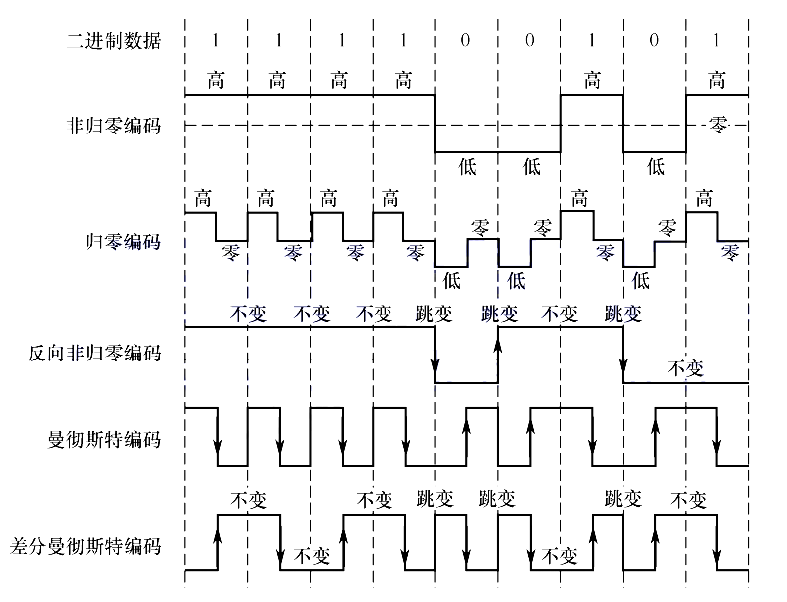 - 曼彻斯特编码: 每个码元中间都会发生跳变,且二进制数据跳变时电平保持不变
