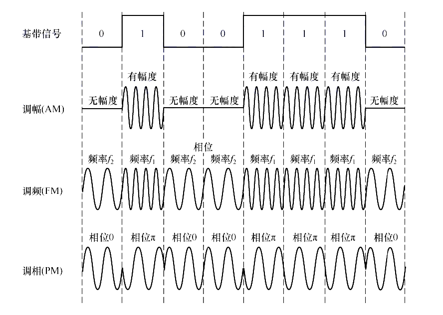 三种调制技术分别对应了载波 \(A\sin (\omega t +\phi)\) 的幅度、频率和相位: