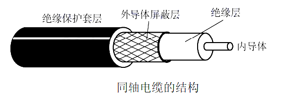 同轴电缆由内导体、绝缘层、外导体屏蔽层和绝缘保护套层构成:
