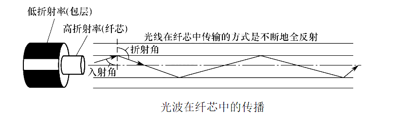 光纤有纤芯和包层构成,包层较纤芯具有较低的折射率,光纤利用了光的全反射特性进行光脉冲信号传输。