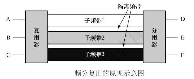 Frequency Division Multiplexing 将信道的总频划分为多个子信道,每对用户使用其中一个子信道进行通信。所有用户在同一时间占用不同频带资源,相邻信道之间还要加入隔离频带,防止相互干扰。
