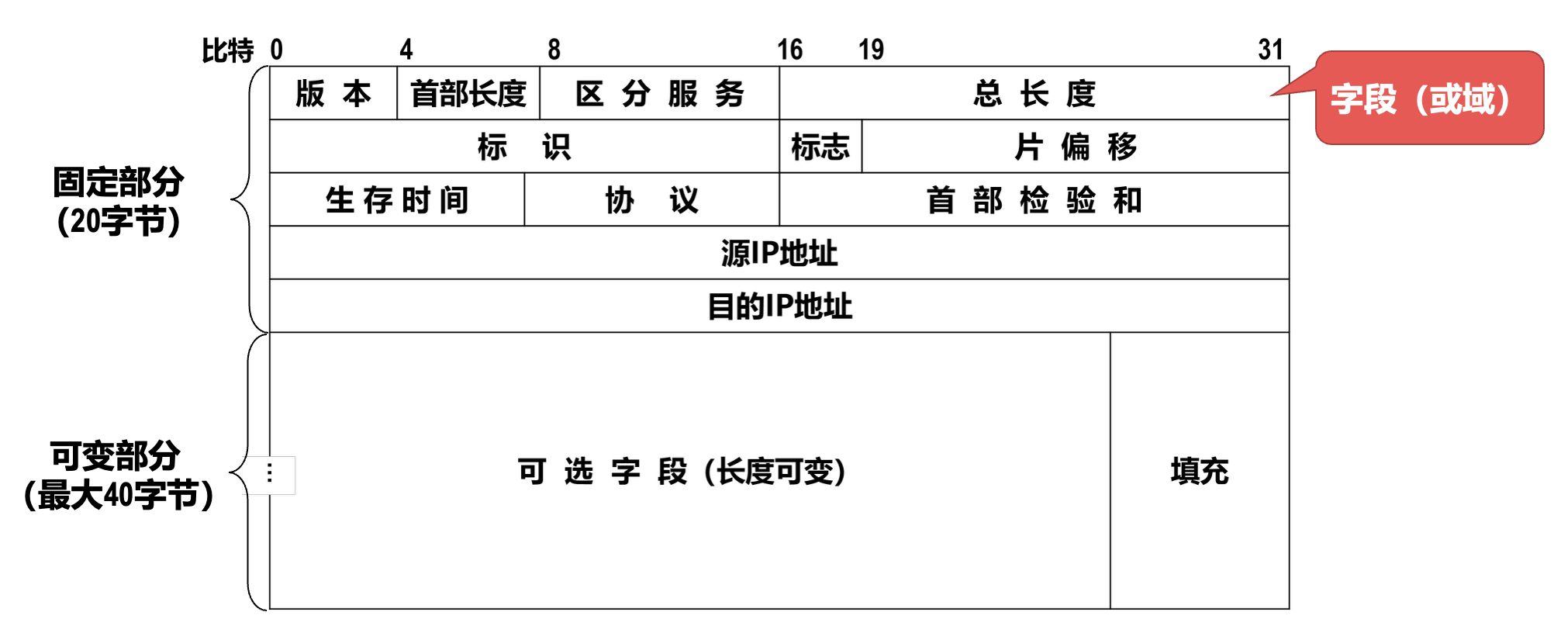 - 源地址、目的地址: 共 32 bit,标识发送方和接收方的 IP 地址