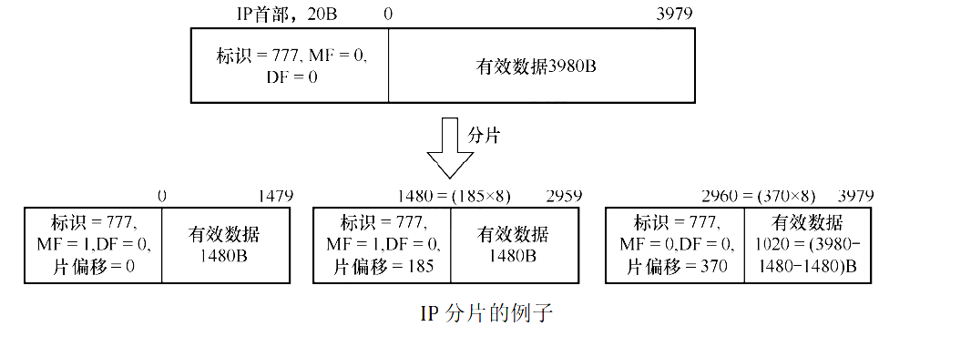 例如,一个 4000B 的 IP 数据报(20B 首部,3980B 数据)需要转发到一条 MTU 为 1500B 的链路上。那么经计算,原始数据报中 3980B 数据被分为三片,每片数据部分依次为 1480B、1480B、1020B,它们的标识号均与原始数据报相同: