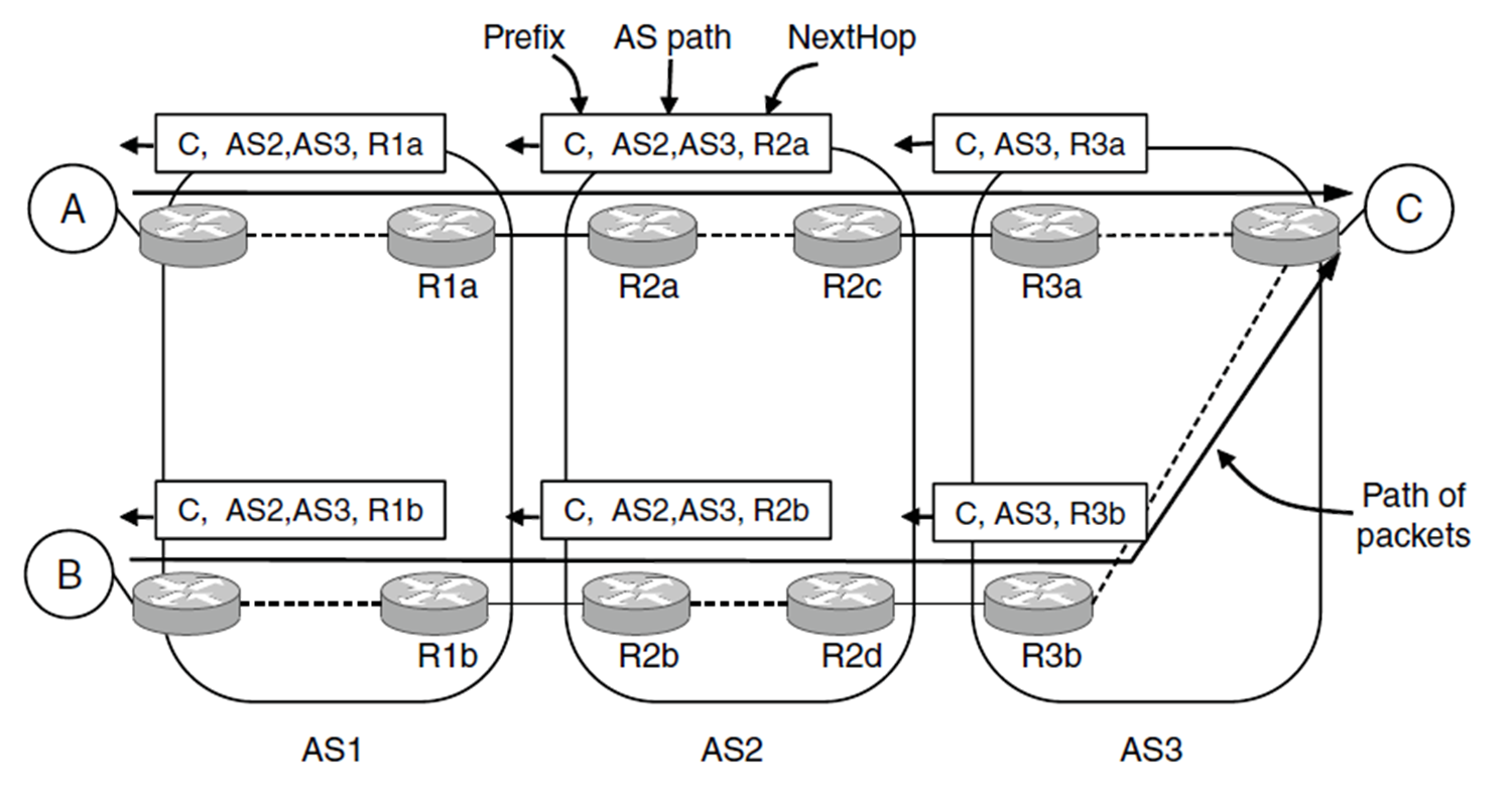 而对于网络 \(A\),它会收到 iBGP 报文 C, AS2, AS3, R1a,表示它要到达网络 \(C\) 需要将分组转发到同一 AS 内部的路由器 R1a 上。此时需要根据内部网关协议找到从网络 \(A\) 到达 R1a 的最佳路由的下一跳并转发,而并不一定是直接转发到 R1a。