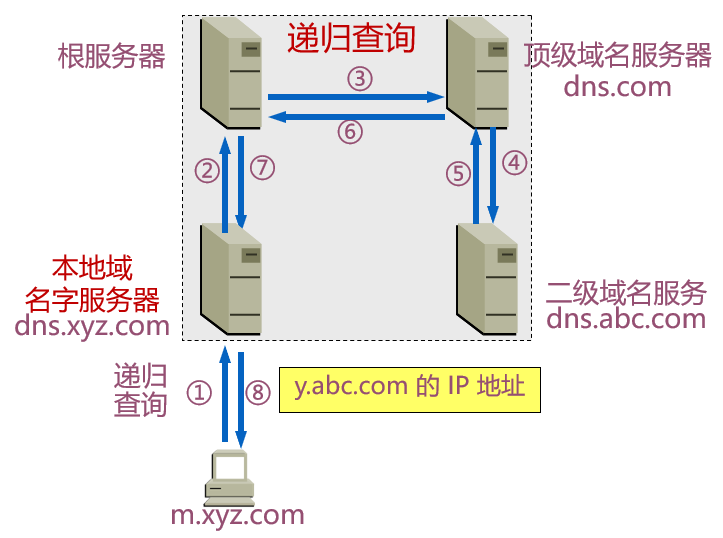 | Local DNS Server | 本地域名服务器 / 递归服务器 | 代用户递归查询 DNS | 运营商 DNS、8.8.8.8 | 查询请求总是先经过本地域名服务器; 本地域名服务器会有映射缓存 |